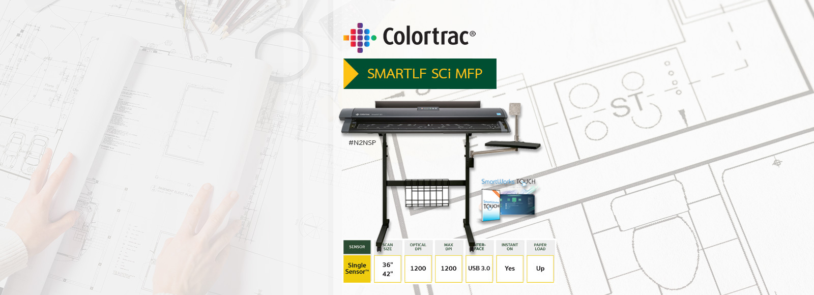 เครื่องสแกนเนอร์ตระกูล SmartLF SCi ที่มาพร้อมกับซอฟต์แวร์ SmartWorks Touch MFP คือ โซลูชัน MFP ระดับมืออาชีพที่ทำให้กลายเป็นเครื่องถ่ายเอกสารหน้ากว้างที่สามารถจัดการเอกสารสี และขาวดำ