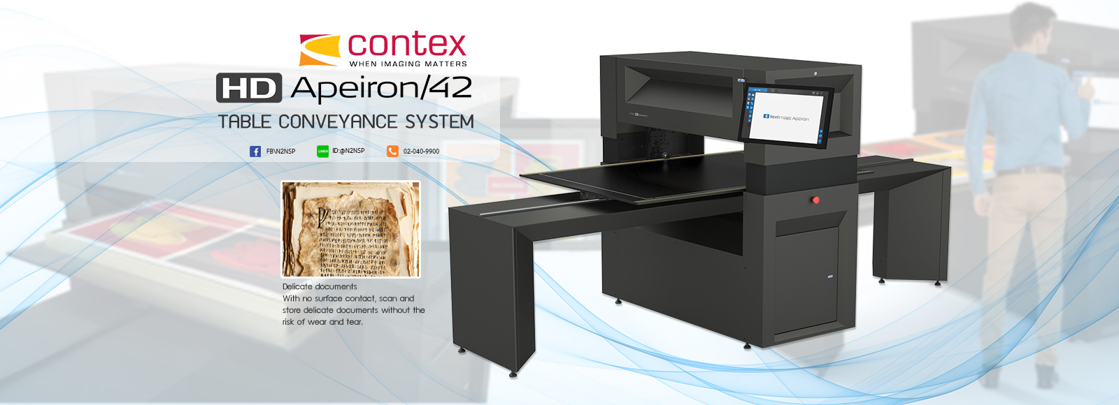 โต๊ะ หรือฐานวางชิ้นงาน ของ เครื่องสแกนเอกสาร และวัสดุ Contex รุ่น HD Apeiron/42 จะถูกขยับ ขับเคลื่อนโดยสายพานไทม์มิ่งที่มีความแม่นยำ เมื่อทำงานร่วมกับระบบลูกกลิ้งรองรับที่แม่นยำ และทนทานต่อการสึกหรออย่างมาก ที่ติดตังตั้งไว้ในแต่ละด้านของโต๊ะ ทำให้เกิดระบบควบคุมทิศทางแบบสามจุดที่มีความเสถียรมาก เป็นเทคโนโลยีที่คิดค้นโดย Contex