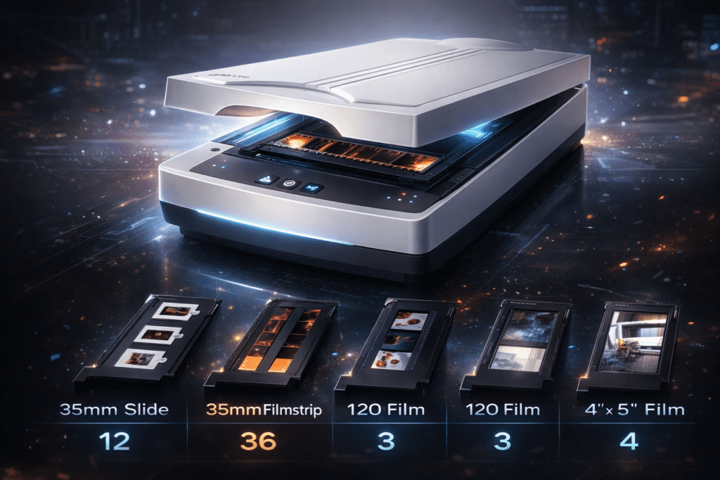 • รองรับฟิล์มทุกฟอร์แมต: ไม่ว่าจะเป็น 35mm Slide (สแกนได้สูงสุด 12 เฟรม/ครั้ง), 35mm Filmstrip (สูงสุด 36 เฟรม/ครั้ง), 120 Film ไปจนถึงฟิล์มขนาดใหญ่อย่าง 4″ x 5″.